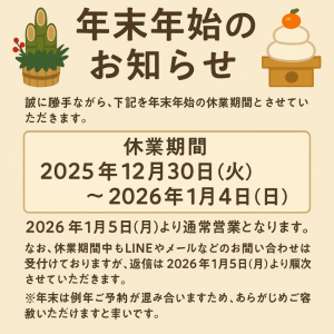 なお、休業期間中もLINEやメールなどのお問い合わせは受付けておりますが、返信は2026年1月5日(月)より順次させていただきます。